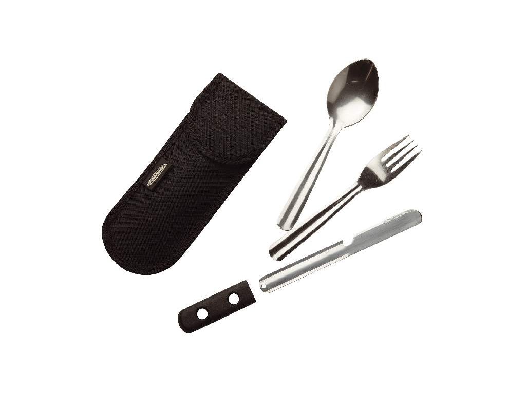Set obsahuje lžíci, vidličku a nůž, takže máte vždy po ruce vše potřebné pro pohodlné stolování v přírodě. Příbory jsou uloženy v kompaktním pouzdře, které chrání ostatní vybavení v batohu a zároveň umožňuje snadné připevnění na opasek.